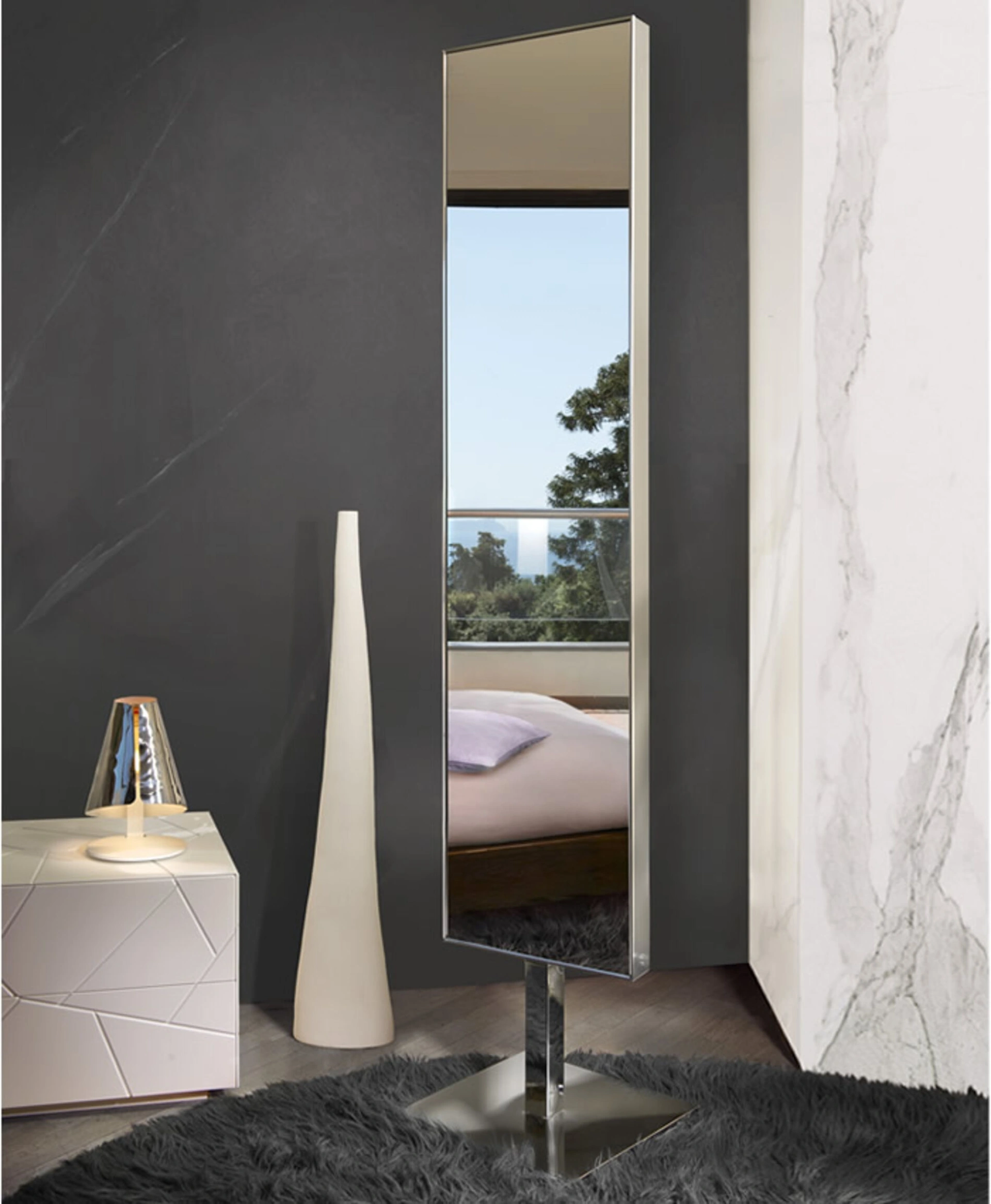 Visitarci vuol dire toccare con mano tutte le più originali composizioni arredative del conosciuto brand, sempre sinonimo di eccellenza e stile. Si addice a un locale di ogni genere il modello di Specchio da terra girevole e bifacciale Voilà di Riflessi che vedi: ultimerà i mobili di casa mixando funzionalità e stile. Nel nostro showroom troverai le più originali collezioni di Complementi moderni che includono anche specchi in metallo di grande qualità e di grande impatto estetico. I Complementi sono oggetti belli e utili per la casa, che connotano la tua casa con i loro colori e ricoprono un ruolo plurifunzionale e essenziale.