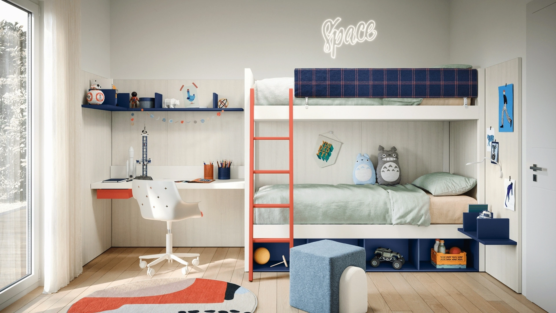 Con la Cameretta con letti a castello Kids space 09 di Nidi in melaminico ti garantirai un perfetto connubio di funzionalità ed ergonomia, ideale per la stanza dei tuoi figli. I nostri bambini trascorrono molte ore delle loro giornate nelle loro camere da letto: rendile adatte per dedicarsi alla scuola, divertirsi e dormire quotidianamente. Le Camerette dei nostri figli sono il luogo in cui cresceranno giocando e sognando, quindi è imprescindibile che lo spazio sia pratico. Proponiamo in negozio diverse Camerette con letti a castello moderne per bambini del marchio, ideali per seguirli durante la loro crescita.