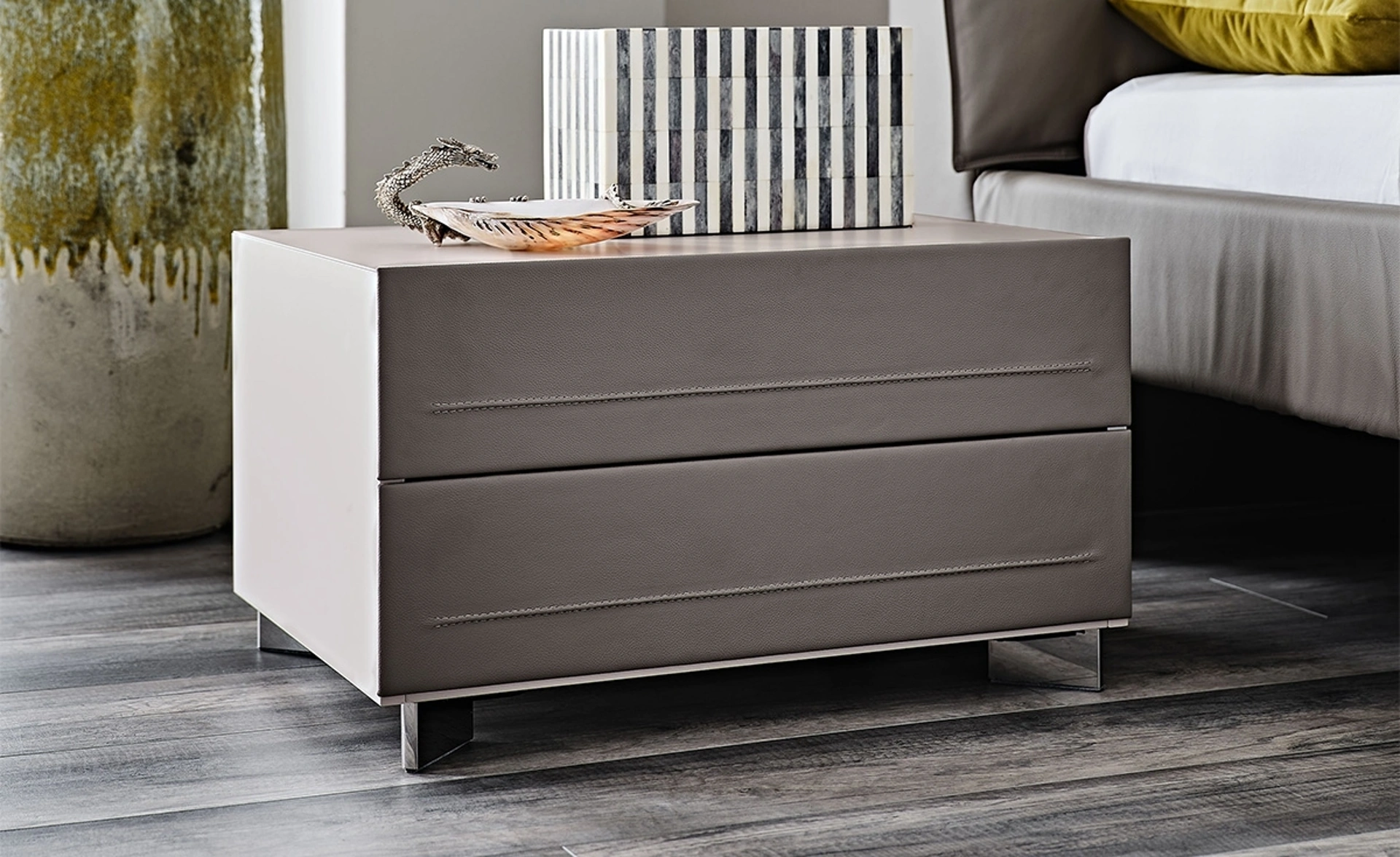Comodino Dyno di Cattelan Italia: contattaci e ottieni informazioni sulle migliori soluzioni di Arredamento Casa disponibili da noi e arreda la tua camera da letto come l'avevi sognata. Eleganti piani per appoggiare, strutture ben fatte, superficie per contenere: nei Comodini design che consigliamo questi vantaggi sono assicurati. Questo tipo di contenitore è fatto in pelle e saprà assicurarti durata, praticità e un ottimo effetto estetico. Nel nostro sito potrai trovare una ricca gamma di mobili e complementi per la camera da letto, tra cui anche il modello in foto.