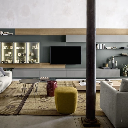 Anche in un soggiorno abbastanza piccolo, questo tipo di arredo riesce a organizzare al meglio gli spazi ottimizzando ogni angolo e garantendo l'alta componibilità tipica delle soluzioni moderne. Questa proposta costituisce tutta la qualità che il marchio garantisce grazie a pluriennale competenza e grande dedizione nel campo dell'arredo e del design. Un po’ librerie, un po’ contenitori ed espositori: le Pareti Attrezzate sono ideali per ottimizzare uno spazio dinamico e operativo. La Parete Attrezzata Code con Mensole di Poliform nell'immagine, con finitura in laccato opaco, risolve le più personali problematiche abitative di stile e spazio senza rinunciare alla ricerca stilistica.