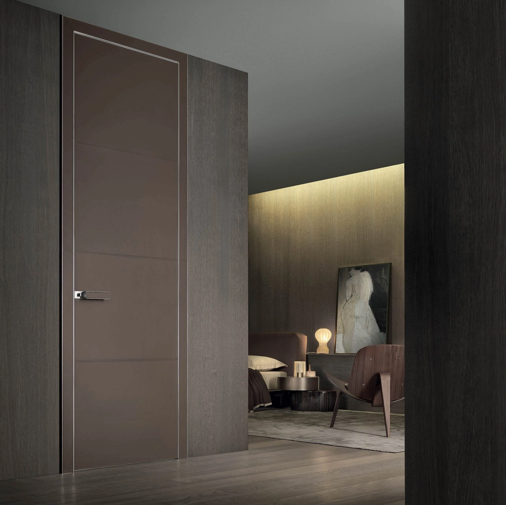 Questo tipo con ante a filo muro dell'azienda Rimadesio consente abbinamenti molteplici, grazie a una quasi infinita gamma di finiture e tonalità di tendenza. Ergonomia e sicurezza caratterizzano tutte le composizioni del brand, tra cui troverai anche questa Porta per interni Luxor in cuoio di Rimadesio con telaio in alluminio. Questi arredi sono indispensabili per dividere i locali interni della tua casa con razionalità e logica, senza tralasciare il tuo stile personale e le tue esigenze. Con le nostre Porte interne design a filo muro gestirai gli spazi ottimamente, garantendoti la giusta privacy tra le stanze e una buona resa estetica.